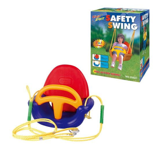 Plastična ljuljačka za djecu do 35 kg. Ljuljačka je predviđena za 3 uzrasta te se može montirati na tri načina, ovisno o dobi djeteta. Dimenzija ljuljačke: 40 × 45 × 28 cm, Dimenzija kutije: 46 × 35 × 23 cm.
