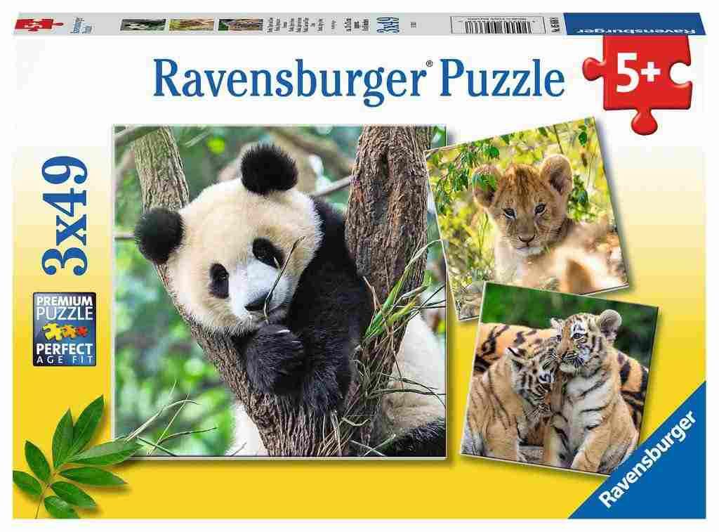 Tri 49-dijelne Ravensburger slagalice s motivom pande, tigra i lava. Za djece od 5 godina dalje.