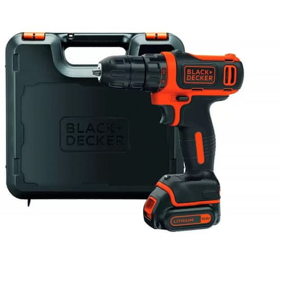 Black&Decker akumulatorska bušilica/odvijač ima 10,8-V bateriju, brzinu do 550 o/min, LED svjetiljku i kompaktan dizajn. Baterija i punjač su priloženi.