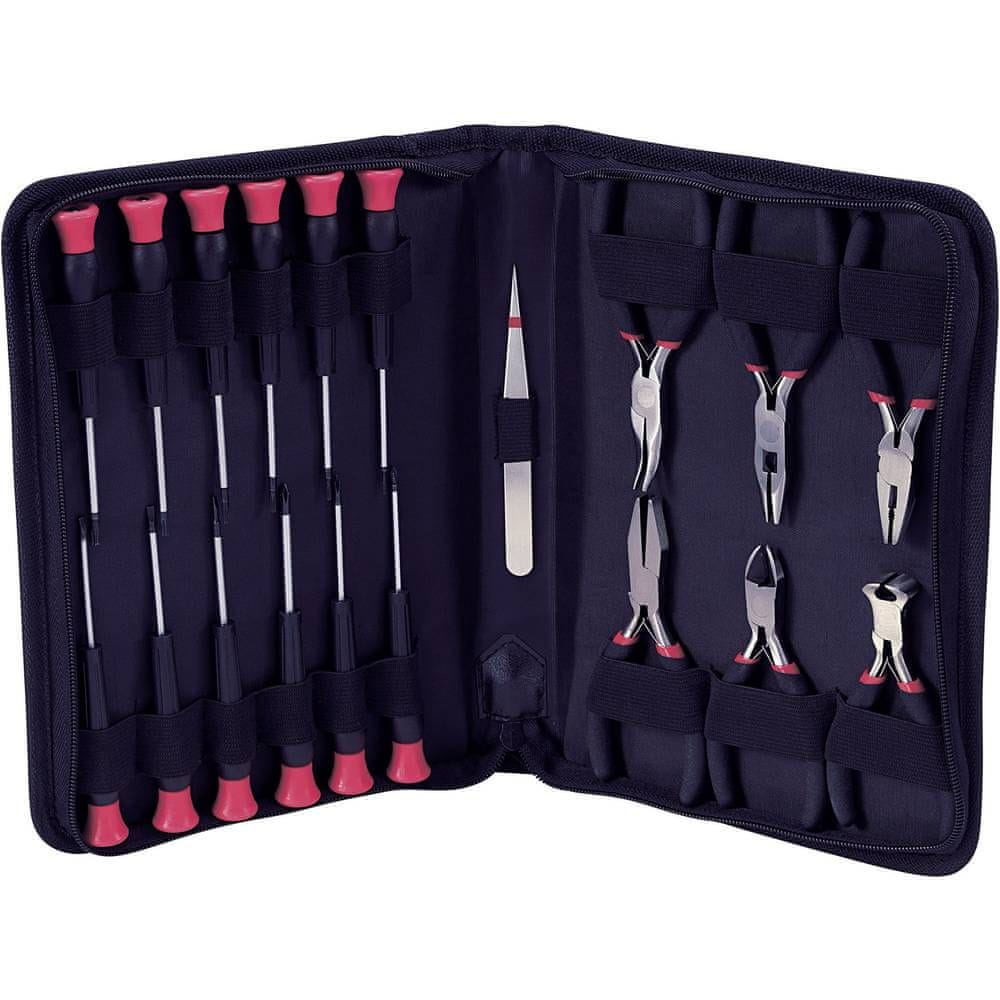 Komplet uključuje raznovrstan izbor preciznih alata. Tu je nehrđajuća pinceta za fin i precizan rad, set od 12 preciznih odvijača (ravni i križni) za različite vrste vijaka, kao i odvijači s T-profilom (Torx). Dodatno, set sadrži 6 različitih mini kliješta, uključujući bočne rezače, ravna i zakrivljena špicasta kliješta, prednje rezače te plosnata kliješta, što omogućuje širok raspon primjene.