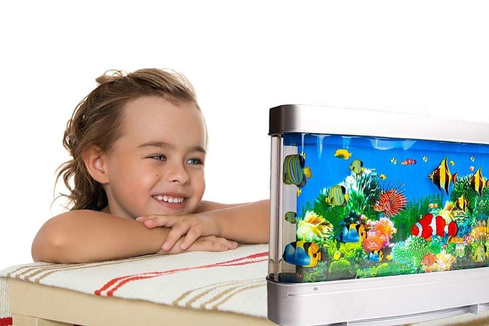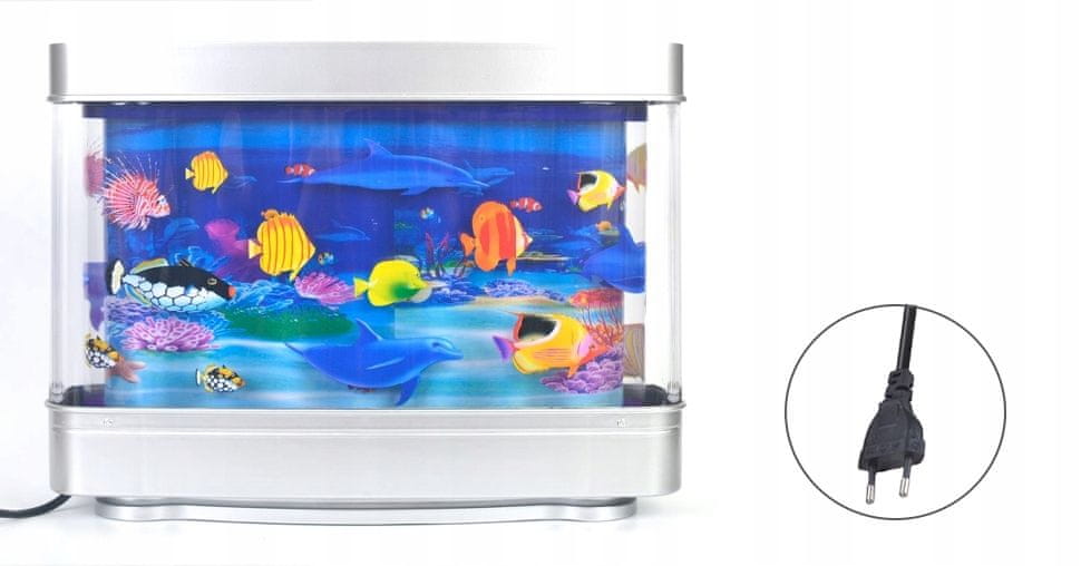 Dekorativna LED noćna lampa u obliku umjetnog akvarija. Uređaj savršeno oponaša izgled klasičnog akvarija koristeći pokretnu tiskanu pozadinu. Dizajniran za postavljanje na ravnu površinu. Svjetiljka koristi svijetlo, neutralno bijelo LED pozadinsko osvjetljenje. Napaja se izravno iz električne mreže (ne zahtijeva stalnu zamjenu baterija). Ugrađeni fizički prekidač za ON/OFF. Savršeno kao svjetlo za opuštanje ili noćno svjetlo u dječjoj sobi.