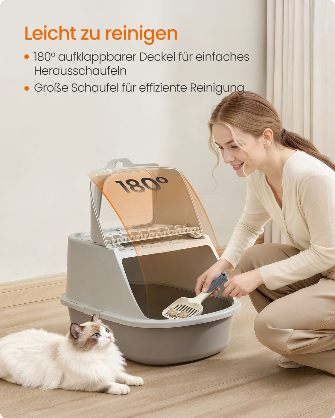 Ova prostrana kutija za mačji pijesak dizajnirana je za udobnost i privatnost većih mačaka. Njezin zatvoreni dizajn pomaže u zadržavanju pijeska i mirisa što je idealno za kućanstva s više mačaka ili veće pasmine. Uključena lopatica i četka olakšavaju i čine čišćenje praktičnim.
