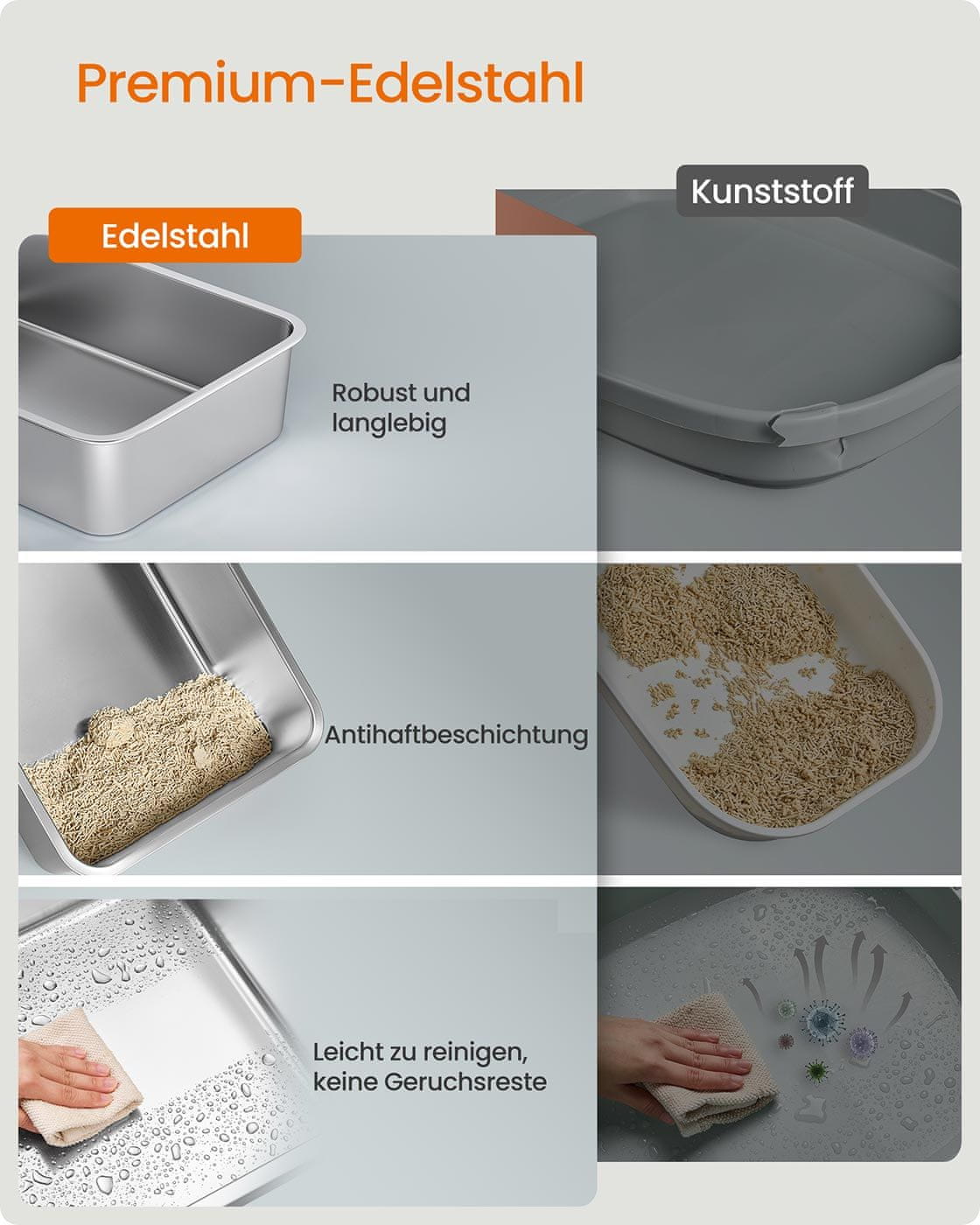 Ova XL kutija za mačji pijesak od nehrđajućeg čelika dizajnirana je kako bi pružila higijensko i praktično rješenje za vlasnike mačaka. Ima poklopac lopaticu za čišćenje i dva ulaza što je čini pogodnom za veće mačke i kućanstva s više mačaka. Robusna konstrukcija osigurava trajnost i jednostavno čišćenje za svakodnevnu upotrebu.