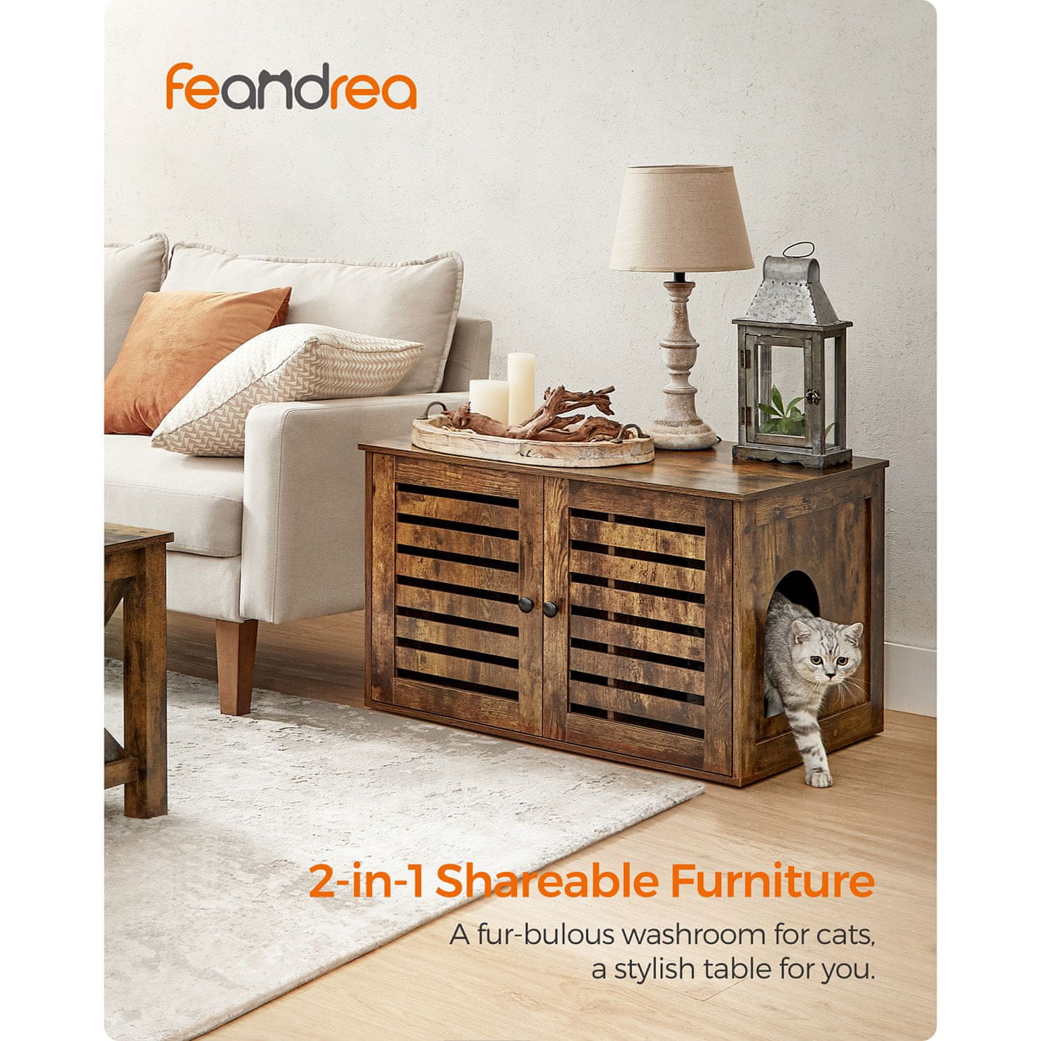 Ovaj moderan ormar za mačji toalet dizajniran je za diskretno skrivanje mačjeg toaleta istovremeno služeći kao dekorativni element u vašem domu. Sa svojom svestranom konstrukcijom može se koristiti i kao pomoćni stol ili noćni ormarić što ga čini praktičnim dodatkom svakoj prostoriji. Ormar ima uklonjivu pregradu i vrata s letvicama za poboljšanu ventilaciju i lak pristup.