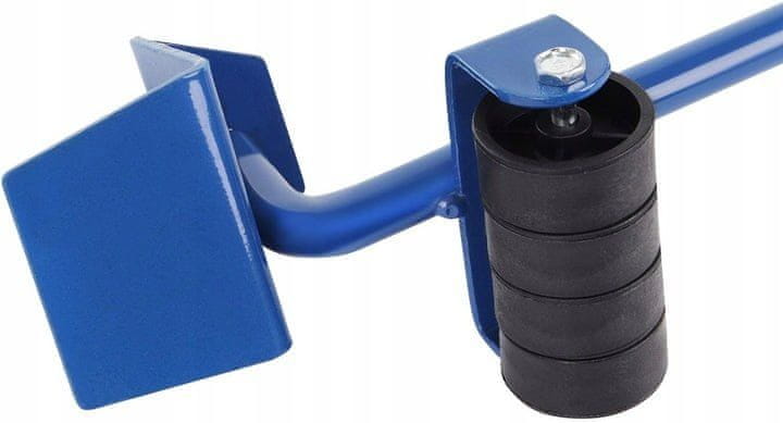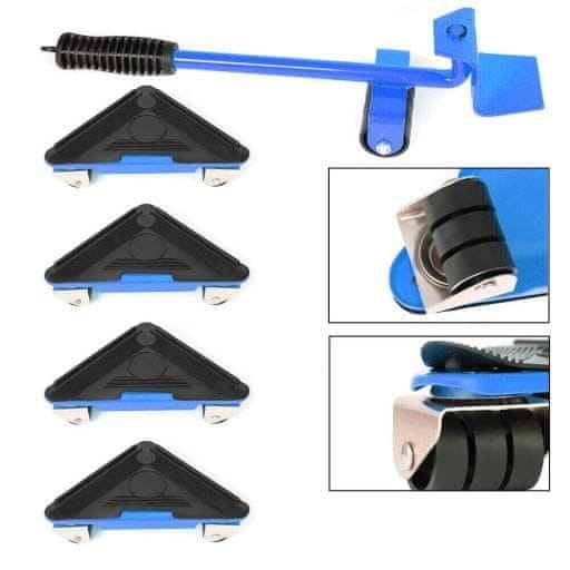 Transportni set s 4 kotača i ručkom za podizanje namještaja idealan je za udobno premještanje teškog namještaja i podizanje vrata. Metalni regali s valjcima, obloženi gumom, namijenjeni za transport i postavljanje namještaja ili drugih tereta težine do 300 kg. Za podizanje tereta prije umetanja baza koristi se čelična poluga.