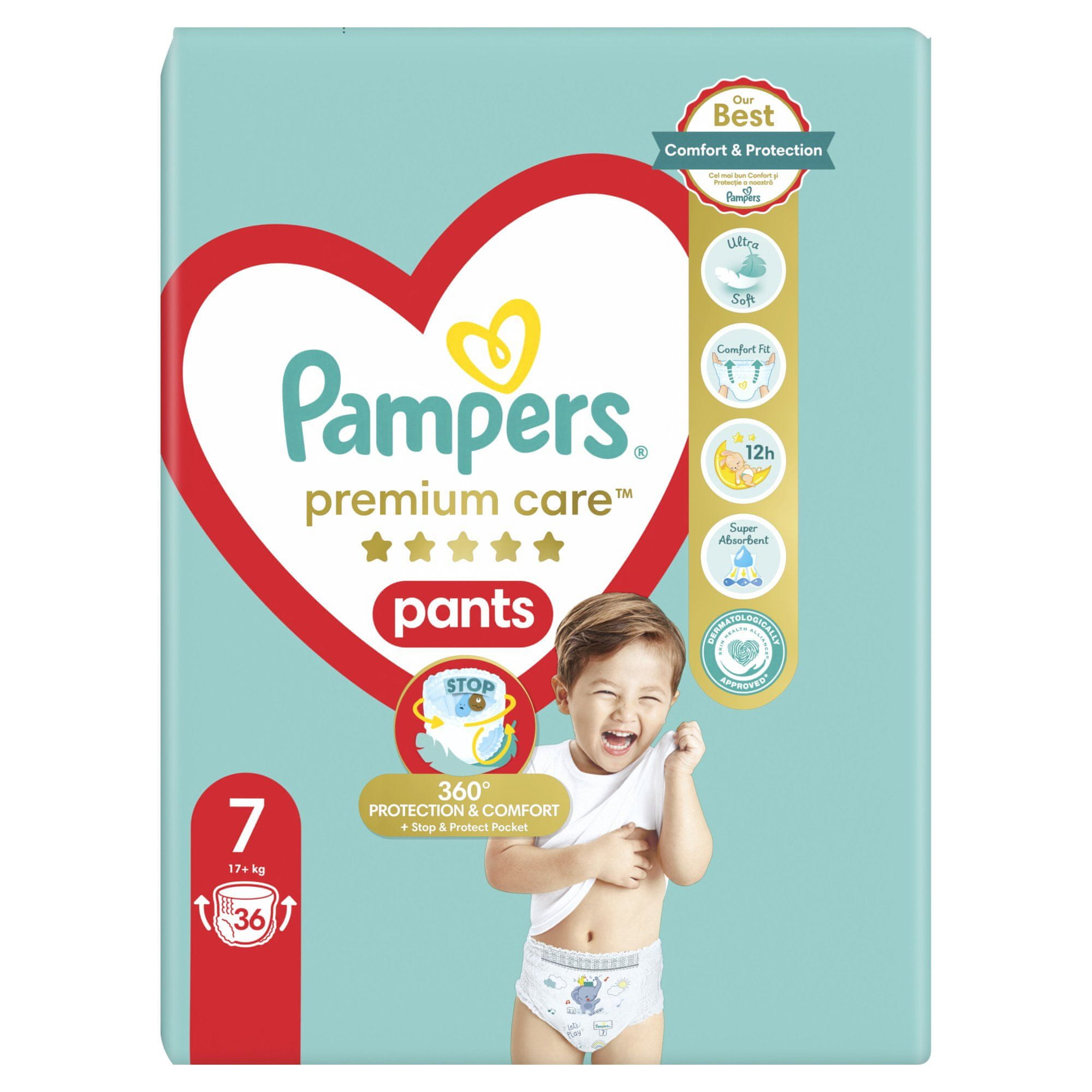 Pampers Premium Care pelene-gaćice s iznimno mekim, potpuno rastezljivim pojasom pružaju najbolju udobnost, dok Stop & Protect pomaže spriječiti curenje natrag do 12 sati, čak i sa najaktivniji mališani.