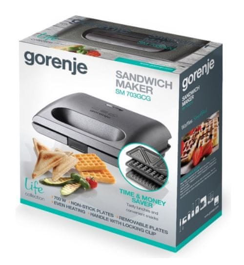 Gorenje kontaktni roštilj SM703GCG djeluje snagom od 700 W i omogućuje vam zamjenu 3 različita panela: rebrasti, trokutasti, vafli. Cijeli opis