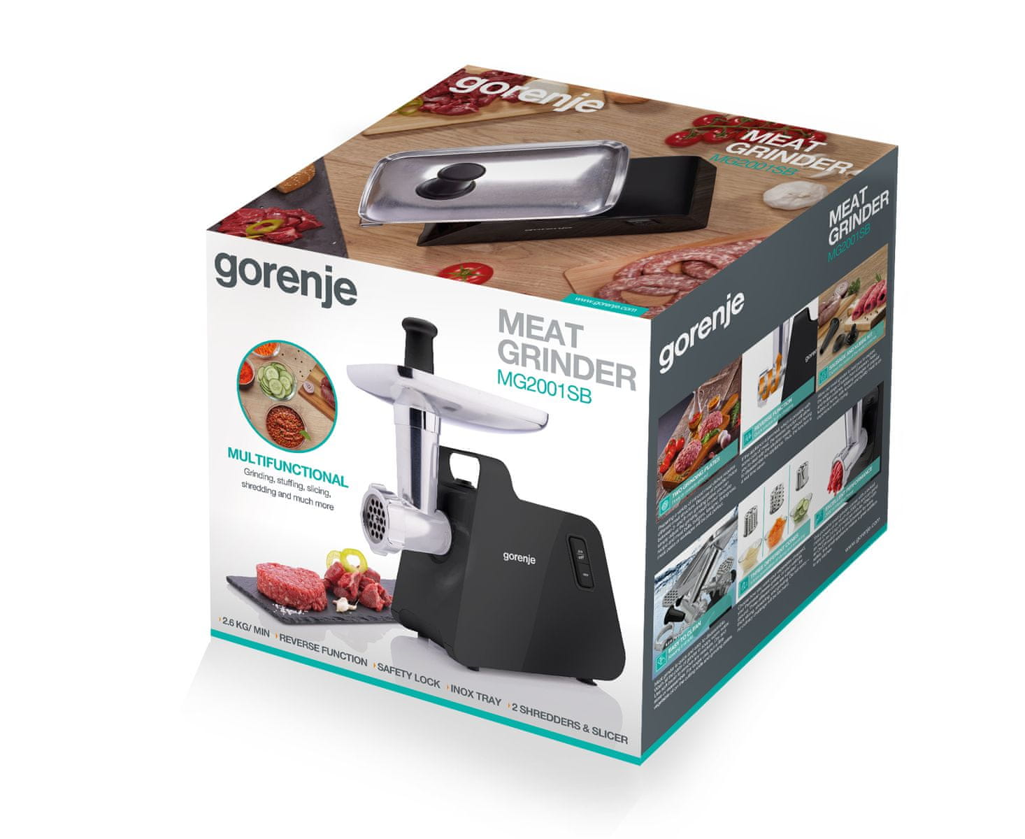 <pStroj za mljevenje mesa ulazne snage 2000 W i kapaciteta mljevenja 2,3 kg/min. Gorenje MG2001SB brusilica ima obrnutu funkciju i usisne noge za savršenu stabilnost. Jednostavan za čišćenje i lagan za nošenje. Uključuje nastavak za struganje, nastavak za rezanje, 2 diska za rezanje, nastavak za punjenje kobasica i nastavak za kebbe. Cijeli opis
