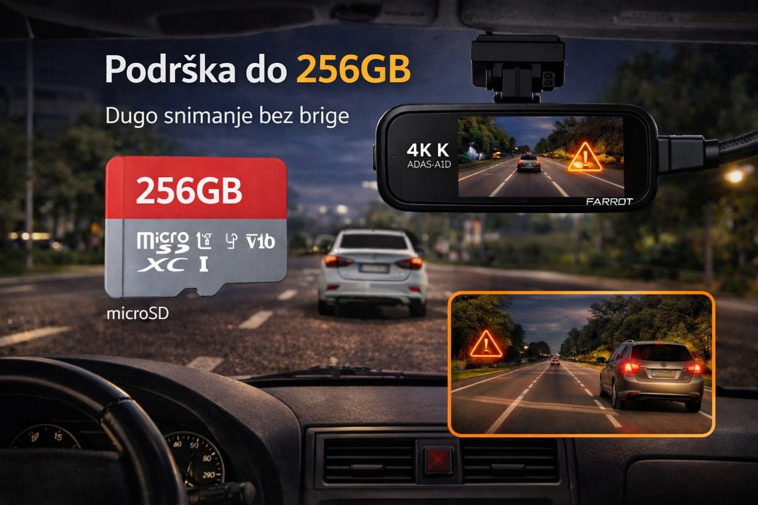 FARROT V26C auto kamera snima u 4K (prednja) i Full HD (stražnja). Ugrađeni GPS, WiFi i parking način osiguravaju potpunu sigurnost i kontrolu. ADAS funkcije dodatno povećavaju sigurnost vožnje. Podržava microSD do 256GB. Cijeli opis