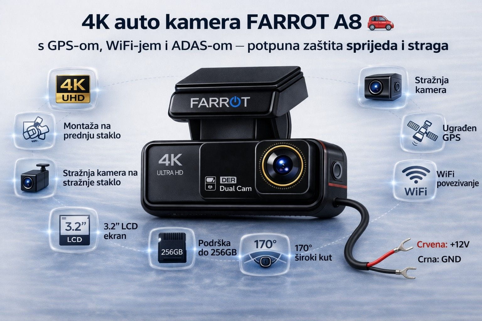 Farrot A8 4K UHD Dashcam (3840×2160), Dual Camera, GPS, WiFi, ADAS, WDR Night Vision, Parking Mode, microSD 256GB