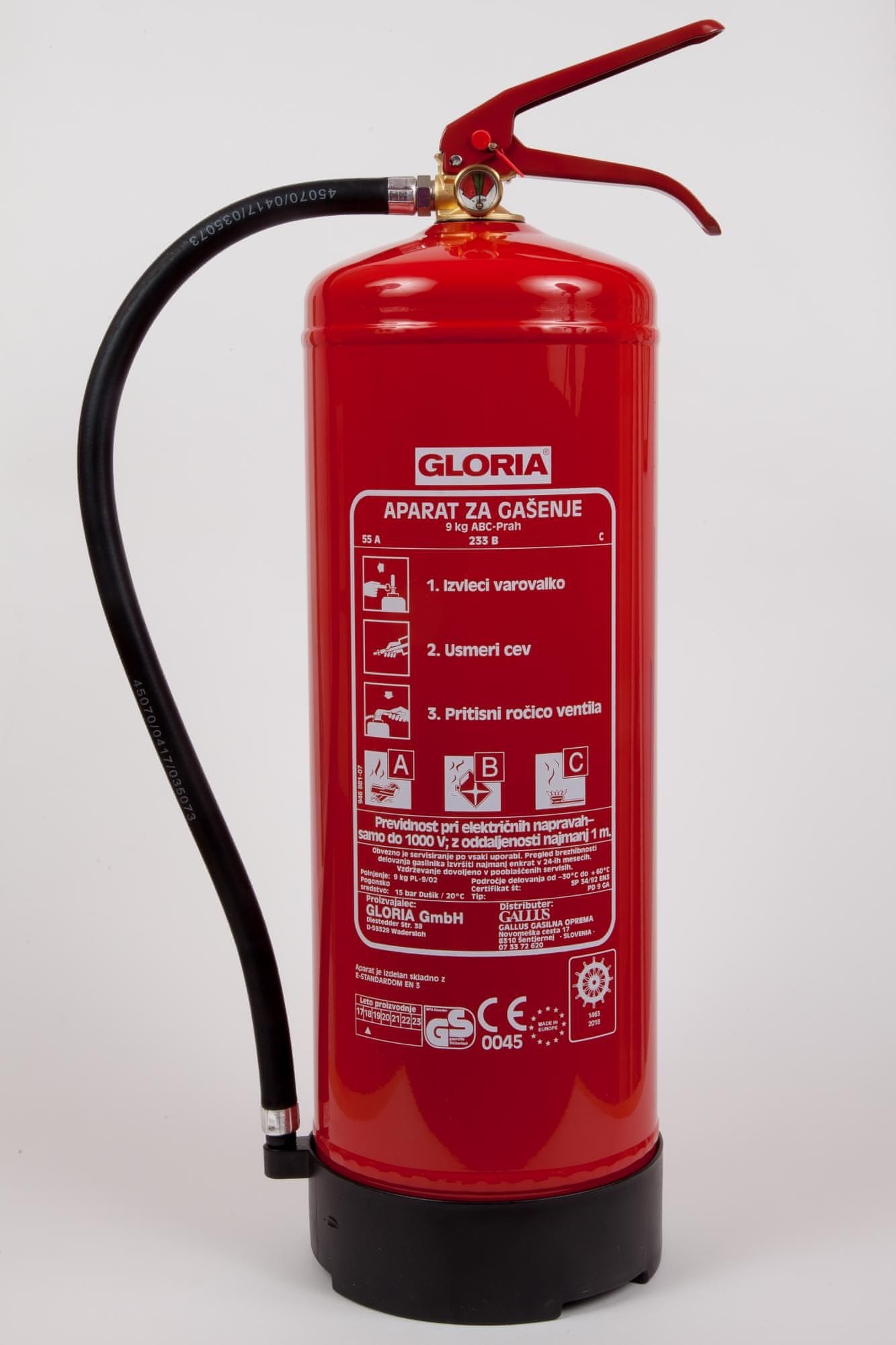 Prijenosni vatrogasni aparat Gloria sadrži prah ABC 9 kg.