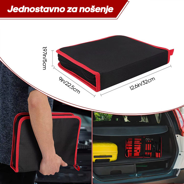Pogrešno postavljanje alata može biti neugodno i dugotrajno. Komplet dolazi s prijenosnom torbicom s patentnim zatvaračem, u kojoj su svi alati organizirani i laki za nošenje, tako da nikada više nećete izgubiti niti jedan komad.