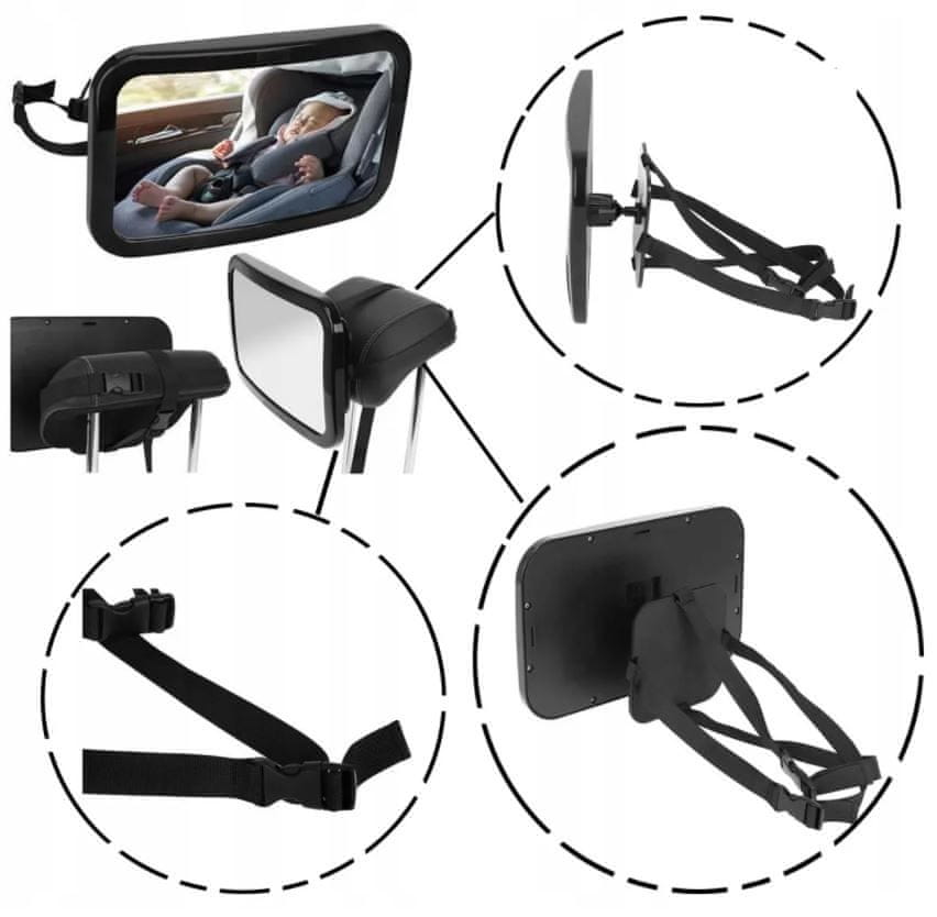 - 4 TRAKE – NAŠ MODEL ima 4 trake fiksirane okomito i vodoravno, koje čvrsto prianjaju uz jastuk i ne olabave se; nema šanse da se ogledalo sklizne i padne na dijete! Trake se kopčaju kopčama i također su podesive, što znači da odgovaraju svakom modelu naslona za glavu, bez obzira na marku i veličinu automobila. Baza koja se postavlja na jastuk ima protukliznu površinu koja dodatno štiti ogledalo od pomicanja.