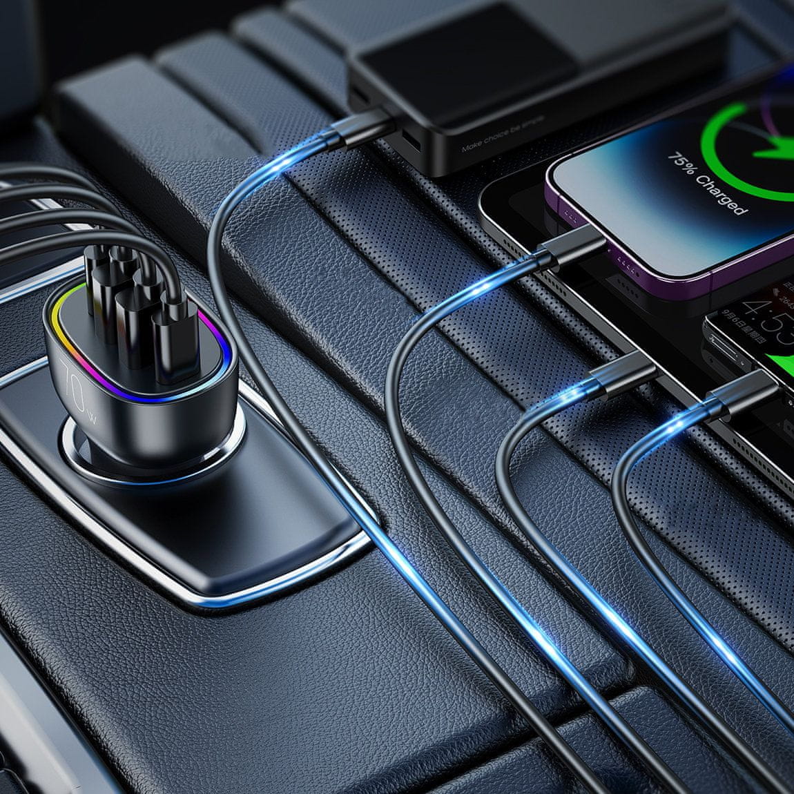 Auto punjač – 2× USB-C i 2× USB porta, snaga 70W, omogućava punjenje do tri uređaja istovremeno, LED osvjetljenje, brzo punjenje Power Delivery, Quick Charge, AFC, PPS, FCP.