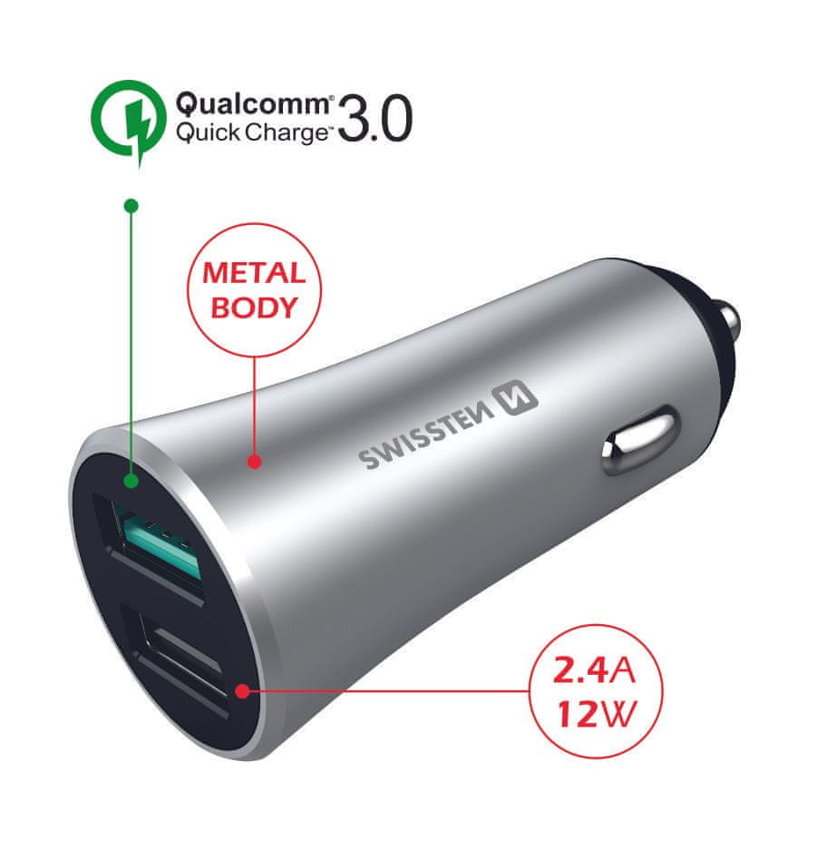 Elegantan automobilski punjač može napuniti do dva uređaja istovremeno. Swissten CL adapter Quick Charge 3.0 + USB 2,4 A 30 W Metal 20111630 ima 2× USB ulaz, 1× s Qualcomm Quick Charge 3.0 a 1× s 5 V / 2,4 A. Ukupno puni 30 W i pogodan je za Android. Cijeli opis