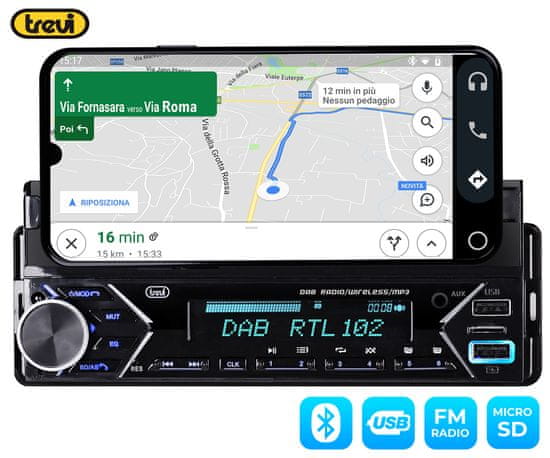Auto radio Trevi SCD 5753 DAB nudi potpunu kontrolu nad iskustvom vožnje. Ima ugrađen kvalitetan LCD ekran i dodatno dolazi sa daljinskim upravljačem. Opremljen je i držačem za telefon koji služi kao idealan prostor za korištenje navigacije na pametnom uređaju. Bluetooth veza je ugrađena za povezivanje, a također možete preuzeti besplatnu SMART BT IPLUG aplikaciju na svoj telefon za potpunu kontrolu auto radija. Auto radio ima 2 USB ulaza, microSD utor i AUX priključak. Zahvaljujući DAB tehnologiji, osim klasičnih analognih radijskih frekvencija, moći ćete slušati i sve postaje koje emitiraju digitalnim radijskim signalom.