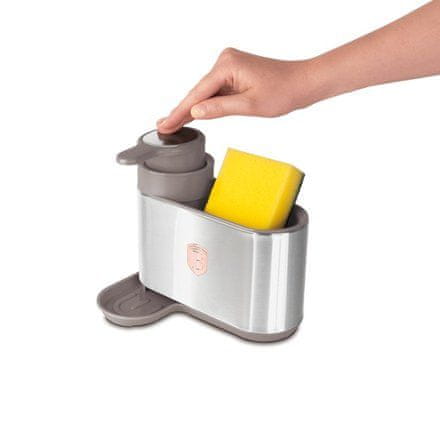 Tehnički parametri:• Materijal: nehrđajući čelik, plastika• Dimenzije: 15,812,717,8 cm• Boja: mat taupeZnačajke:• 2 u 1: dozator deterdženta s držačem spužve• Glatka glava dozatora• Jednostavno punjenje• Otporno na otiske prstiju• Pladanj za kapanje – jednostavno čišćenje• Dizajnirano za uštedu prostora
