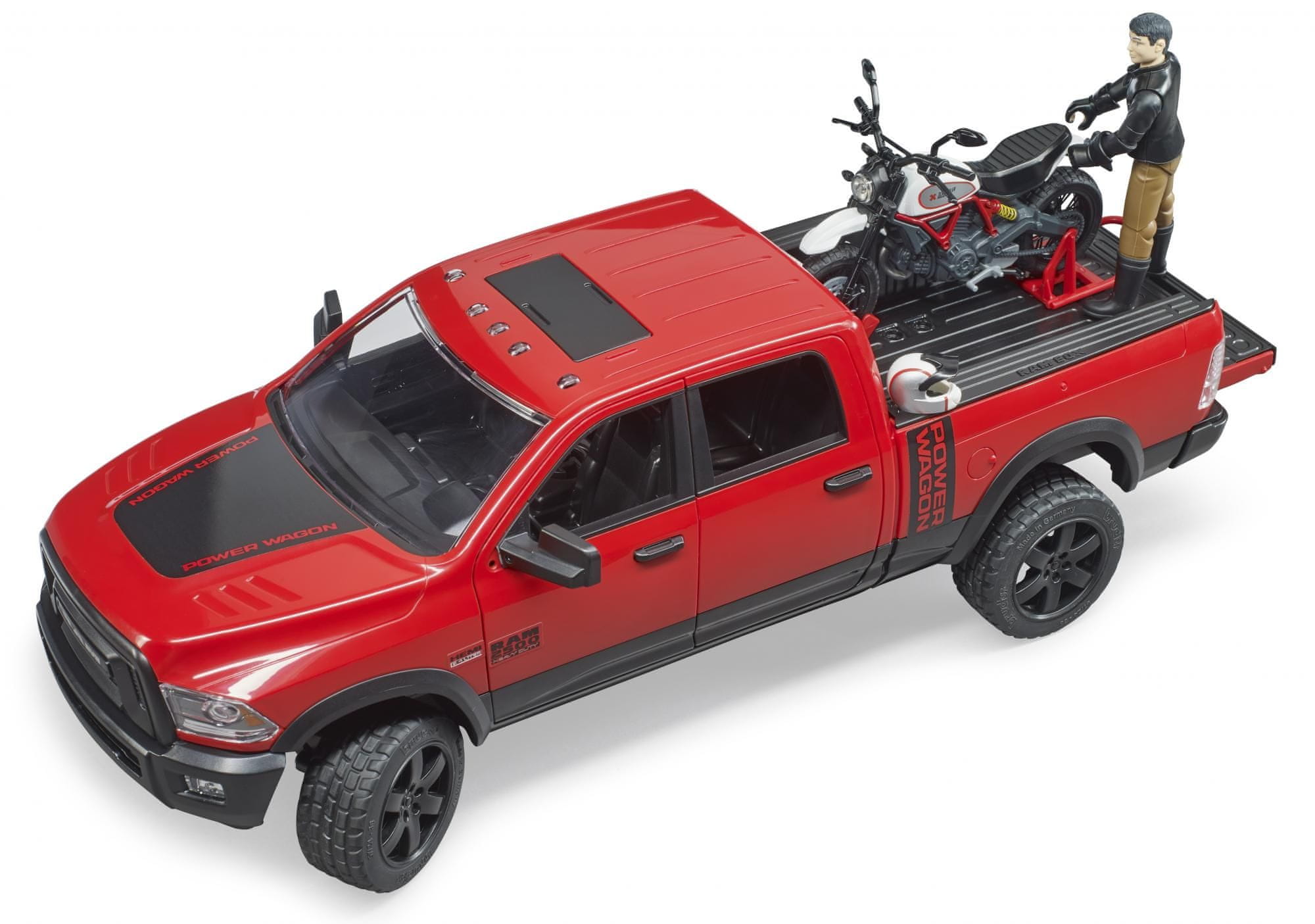 Set Bruder s terenskim automobilom RAM 2500, koji na svom tijelu nosi motocikl Ducati. Elegantna odjeća uključuje i figuricu s priborom koja može sjesti za volan ili na motocikl. I automobil i motocikl imaju brojne funkcionalne elemente poput upravljive osovine, otvaranja vrata i slično.