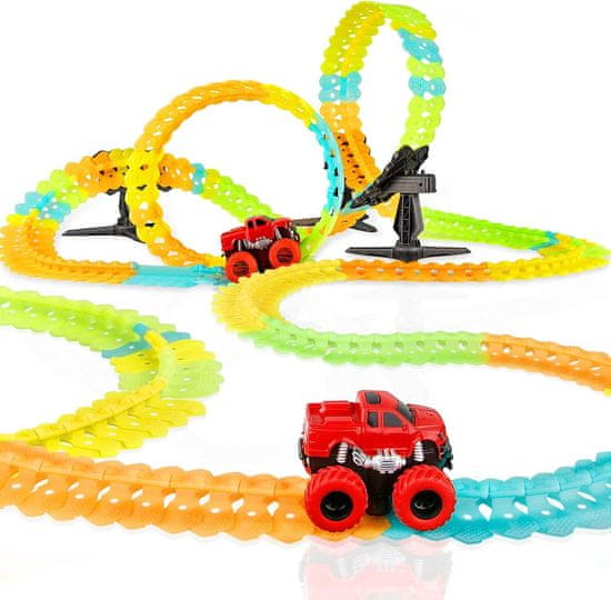 JOJOY® Svjetleća staza za autiće 350 cm, komplet pista s autićem na baterije koja svijetli u mraku | LUMITRACK