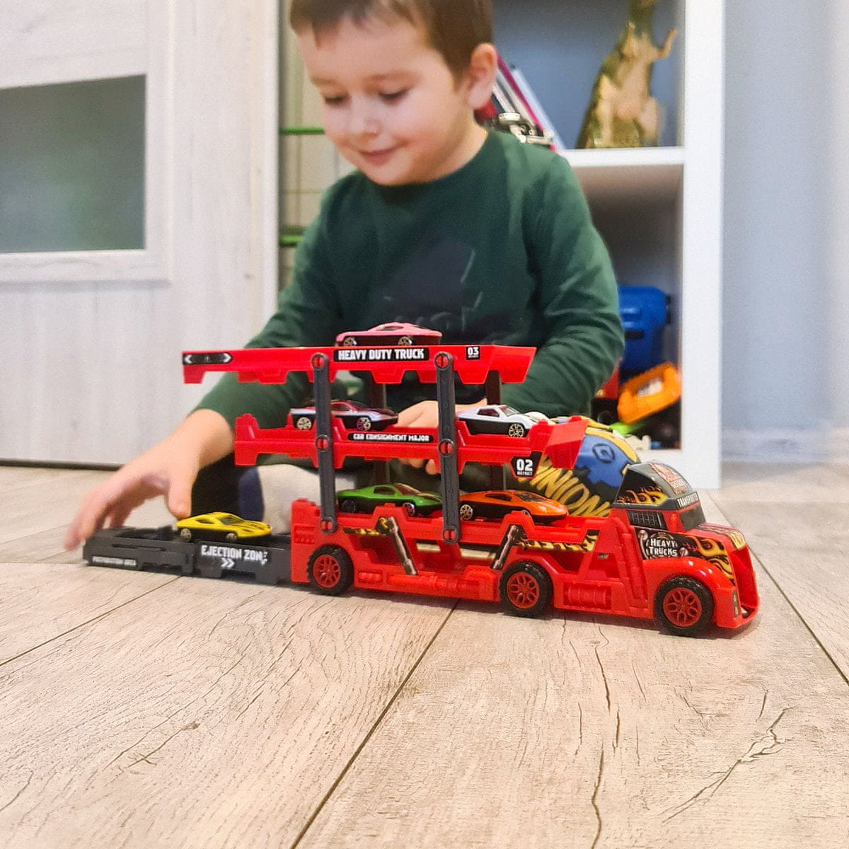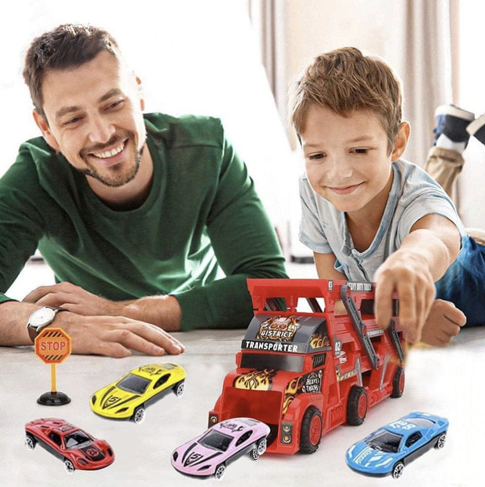 - PRIKOLICA + 6 LIJEVANIH AUTOMOBILA – set se sastoji od kamiona i 6 automobila. Kamion za vuču ima funkciju sklapanja, zahvaljujući kojoj možete lako ukloniti automobile. Igračka je rađena s velikom pažnjom, s reprodukcijom svakog detalja. Djeluje realistično, što potiče dijete na igru.