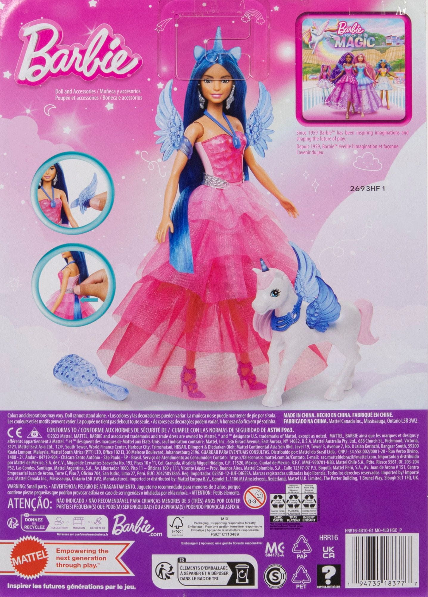 Proslavite 65. godišnjica Barbie® s ovom prekrasnom lutkom jednoroga sa safirnim krilima. Ova kolekcionarska lutka inspirirana je filmskim likom Barbie® s dozom magije. Uključeni su preslatki dodaci za lutku i njenog prijatelja jednoroga.