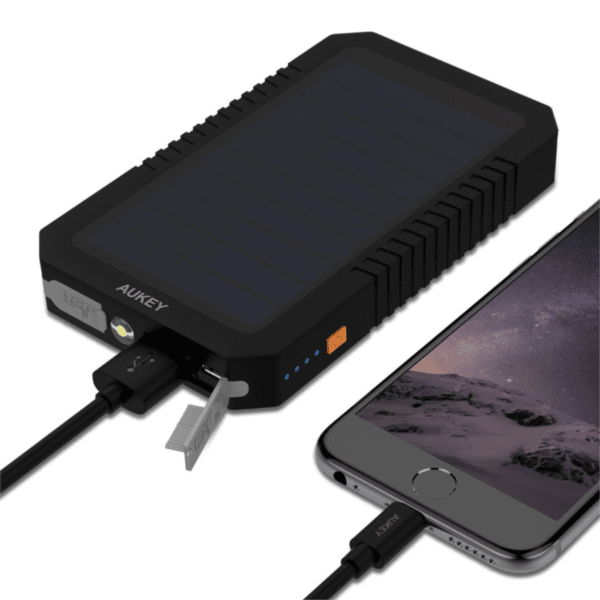Aukey 12000mAh Solar Power Bank je prijenosna baterija kapaciteta 12000mAh. Nudi mogućnost punjenja pomoću solarnih ćelija, te micro-USB adaptera. Kompatibilna je sa svim pametnim telefonima i ima dva USB izlaza za napajanje 1A i 2.4A, oba na 5V.
