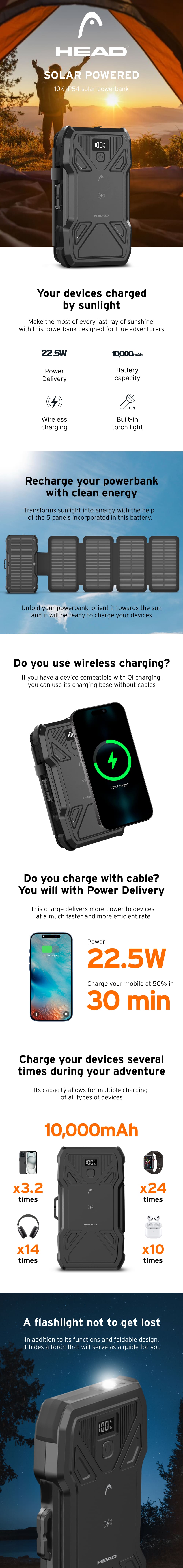 Punite svoje uređaje bilo gdje i bilo kada uz HEAD solarnu power bank bateriju kapaciteta 10.000 mAh. Ovaj praktičan i izdržljiv vanjski punjač idealan je suputnik za sve vaše avanture – od planinarenja i kampiranja do putovanja i svakodnevnog korištenja.