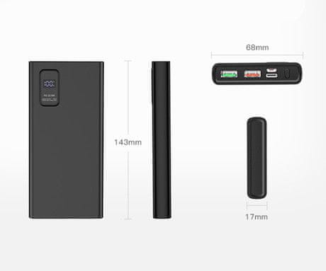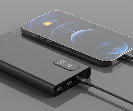 Power bank ima 2× USB Type-A i 1× USB Type-C priključka, koji vam daju mogućnost istovremenog punjenja do 3 uređaja! Punite punjivu prijenosnu bateriju putem microUSB ili USB Type-C izlaza, a uključen je i kabel za punjenje od 30 cm. Sučelja omogućuju nevjerojatno brzo punjenje, tako da ih možete koristiti za punjenje uređaja poput pametnih telefona, tableta, fotoaparata, kamkordera, audio playera, igraćih konzola, navigacijskih uređaja, prijenosnih računala.