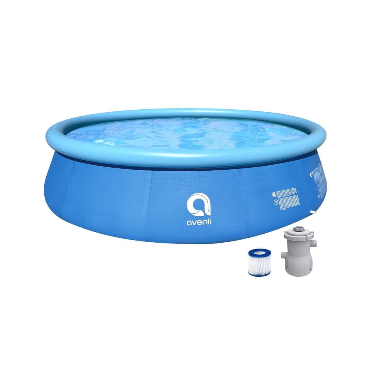 Bazen Avenli Prompt Set promjera 3.60 m i visine 76 cm s filter pumpom u setu izvrstan je za opuštanje i rashlađivanje tijekom ljetnih vrućina. Opremljen je zračnim prstenom koji jamči stabilnost kružnog oblika a stijenka bazena je od postojanog troslojnog PVC-a.