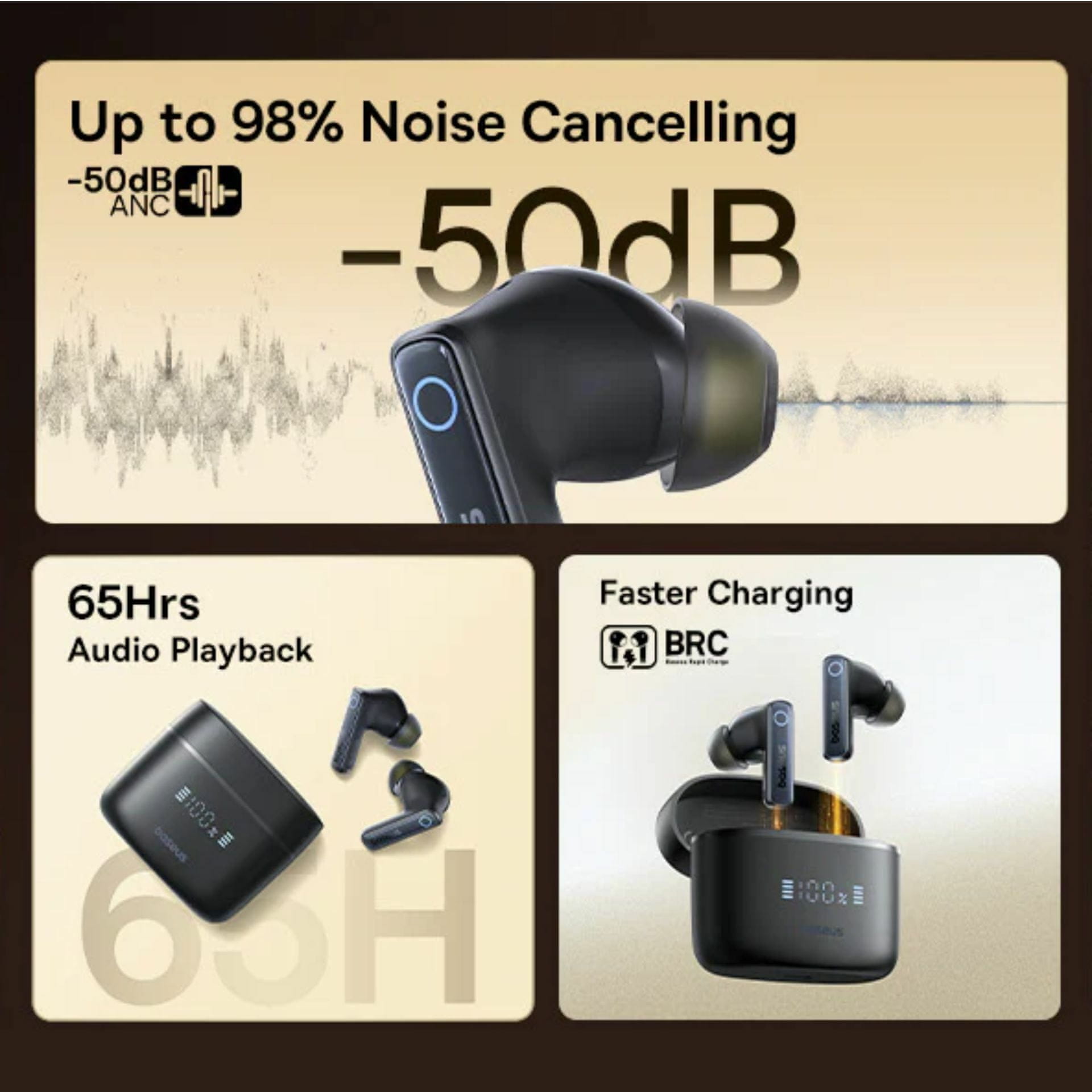 – Posebne funkcije: Aktivno uklanjanje buke (ANC) do –50 dB, 6 mikrofona za jasne pozive, snažan bas, baterija od 65 sati, LED prikaz napajanja