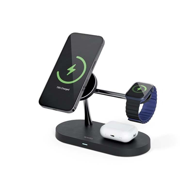 Stanica za punjenje spaja minimalistički dizajn s praktičnošću tehnologije MagSafe, jer omogućuje istovremeno bežično punjenje telefona, sata Apple Watch i slušalica AirPods. Zahvaljujući snažnom magnetskom mehanizmu telefon je sigurno pričvršćen pod kutom, što korisniku omogućuje neometan pregled zaslona i korištenje uređaja čak i tijekom punjenja.