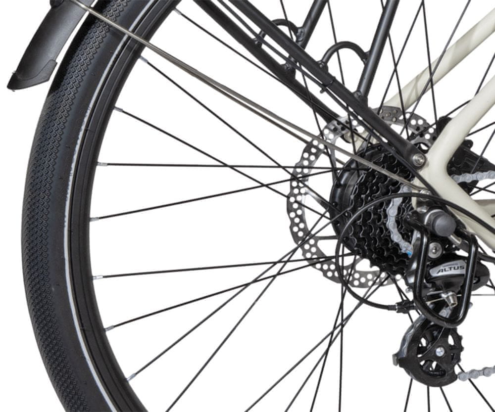 | Značajke i funkcije: | višenamjenska upotreba, univerzalni okvir od aluminijske legure veličine M, cestovne gume 27,5" (69,85 cm), motor stražnje glavčine od 250 W, izmjenjiva punjiva baterija kapaciteta 360 Wh 36 V 10 Ah, domet do 60 km s jednim punjenjem, 8-brzinski SHIMANO mehanizam mjenjača, integrirani LCD zaslon sa svim informacijama o vožnji, LED rasvjeta sprijeda i straga, hidraulične disk kočnice sprijeda i straga, besplatna aplikacija za pametne uređaje BIKEWISE, SMT metoda proizvodnje okvira bez zavarivanja, sigurnosni reflektori, sklopiva parkirna nožica, nosač stražnjeg kotača |