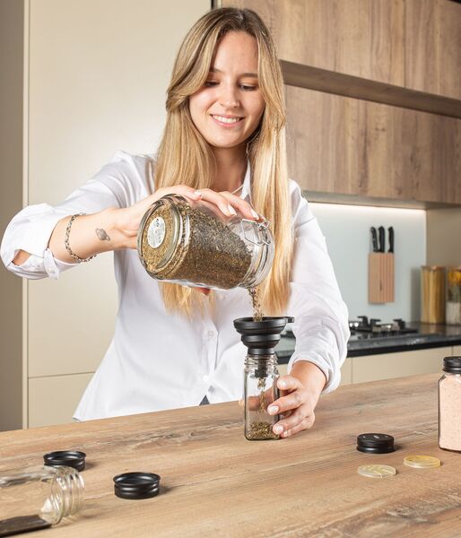 • ZA VAŠE UDOBJE – pokrovčki zagotavljajo nepredušno zapiranje, zato bodo vaša zelišča ostala dlje časa sveža! Komplet vključuje 2 vrsti pokrovčkov za stresanje z različno velikimi odprtinami. S silikonskim lijakom boste kozarčke napolnili enostavno in brez stresanja!