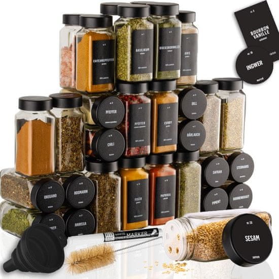 Ne dobivate samo 36 izvrsnih teglica za začine, već cijeli set u kojem ćete pronaći sve što vam treba. Uključeno je 100 unaprijed tiskanih okruglih naljepnica s imenima začina na njemačkom, 100 unaprijed tiskanih pravokutnih naljepnica s imenima začina na njemačkom, 40 praznih okruglih naljepnica i 40 praznih pravokutnih naljepnica na koje možete pisati priloženim visokokvalitetnim krednim flomasterom.