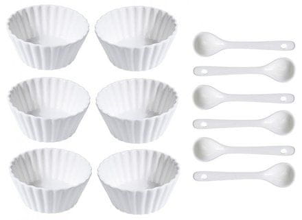 - materijal: bijeli porculan – idealno za posluživanje predjela, grickalica, slastica, umaka i umaka – dimenzije jedne zdjelice cca.: 9 × 4 cm – otporno na toplinu do 220 °C, može se koristiti i za pečenje u pećnici – može se prati u perilici posuđa – set od 12 dijelova uključuje: – 6 x porculanska zdjelica – 6 x porculanska žlica