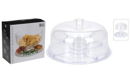 - višenamjenska zdjela za posluživanje s pladnjem – ukupno 6 različitih načina korištenja koje se mogu kombinirati – pladanj podijeljen na nekoliko dijelova za posluživanje grickalica – kao zdjela za čips ili tortilje sa zdjelicom za umak u sredini – kao pladanj za kolače ili deserte s poklopcem – zaseban pladanj za kolače i deserte – zaseban poklopac, npr. za dasku za sir – prozirna kaljena PS plastika – praktičan pomagač za posluživanje hrane, širok raspon upotrebe – promjer 30,5 cm – visina 20 cm