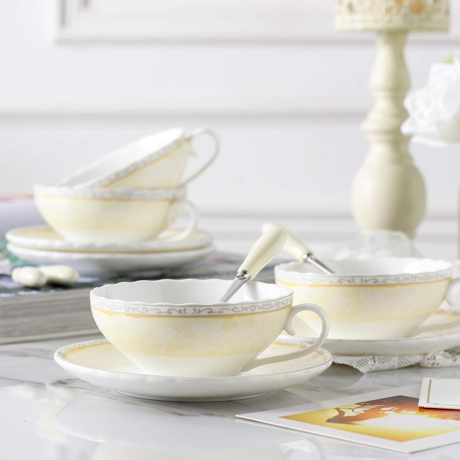 Nikcorp Set porculanskih šalica i tanjurića s žličicama za 4 osobe, fini koštani porculan, elegantni cvjetni uzorak, bijela/žuta