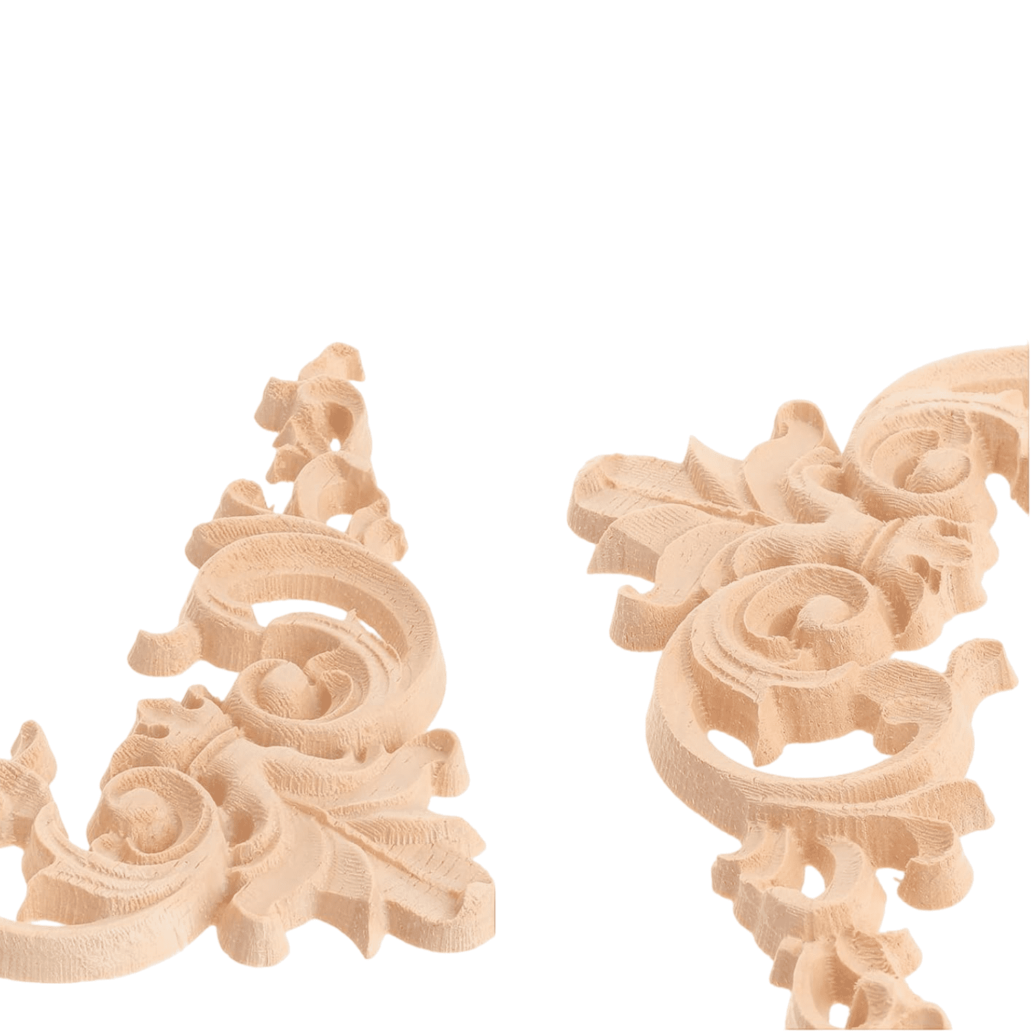 Ovaj set od 4 drvena dekorativna kutnika idealan je dodatak za stiliziranje namještaja, okvira, vrata ili ogledala u vintage stilu. Svaki element dimenzija 10 × 10 cm izrađen je od punog drva s precizno izrezbarenim uzorkom, što interijerima daje eleganciju i klasičan karakter. Prirodna, nelakirana boja omogućuje bilo kakvu završnu obradu – bojanje, bajcanje ili lakiranje prema vlastitim željama. Dekorativne aplikacije izvrsno će poslužiti kao ukras kutova ormarića, okvira za slike, fronti namještaja ili ogledala.