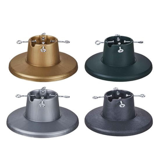 Okrugli stalak za pravo ili umjetno božićno drvce. Veličina proizvoda: FI 38.5 × 16cm (v). Materijal: izdržljiva plastika. Boja na izbor: zelena, zlatna, srebrna, siva. Zapremnina spremnik za vodu: 1.6 lit. Prikladno za max visinu stabla: 2,1 m. Prikladno za promjer debla: 35–105 mm. Cijeli opis