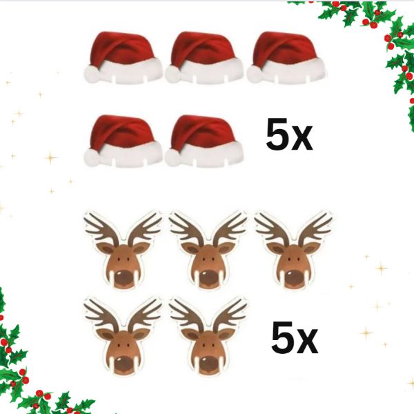Pakiranje sadrži 10 ukrasa (5× kapa Djeda Božićnjaka i 5× jelen), širine 6 cm i visine 3,7 cm.