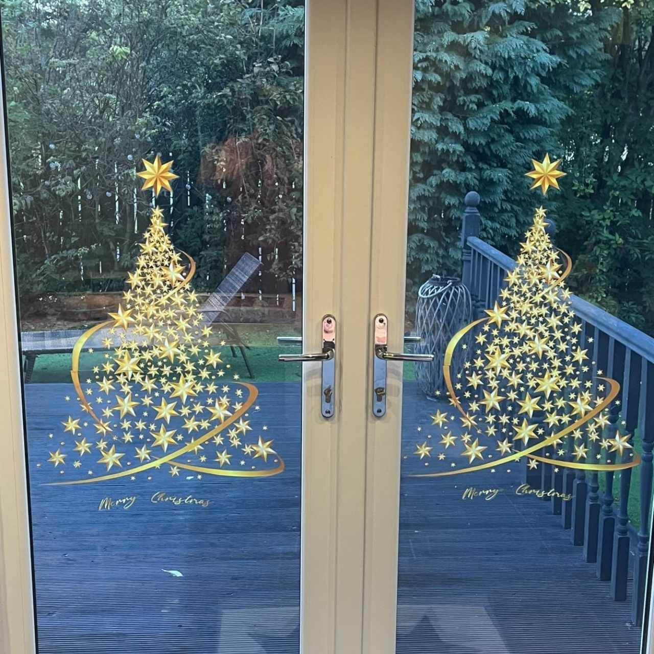 Netscroll Božićne naljepnice za prozore, motiv božićnog drvca, božićni ukras (2 komada), zlatna PVC dekoracija bez ljepila, pogodna za staklo, ogledala i vrata, GoldenTree