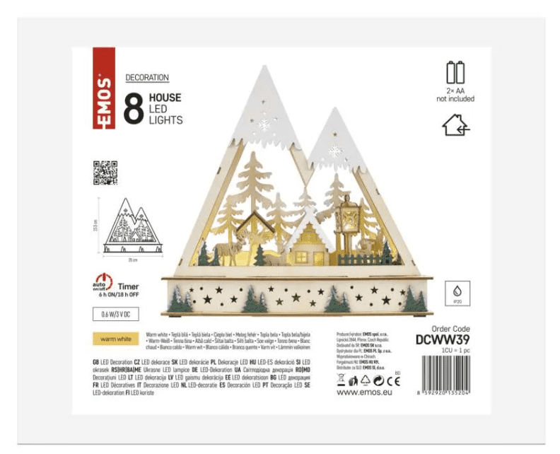 Drveni božićni pejzaž Emos sa 8 LED lampica, IP20 zaštitom i do 10.000 sati svjetla.