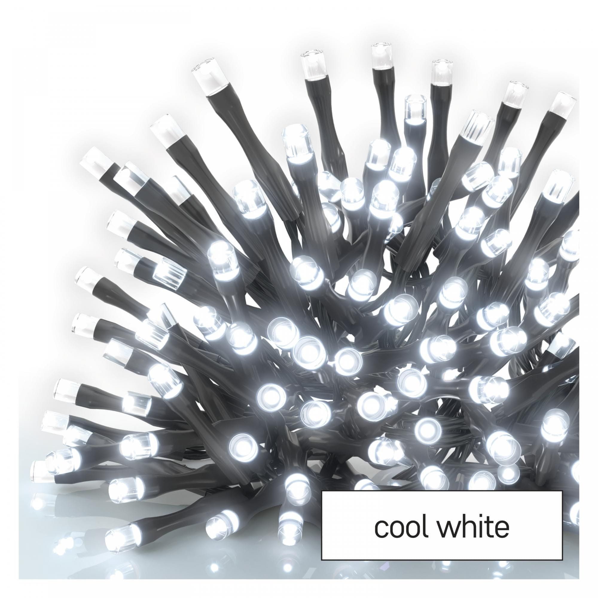 Spojni niz marke EMOS za vanjsku i unutarnju uporabu u obliku lancacrnoj boji, dužine 5 m i s hladnom bijelom bojom svjetlosti.