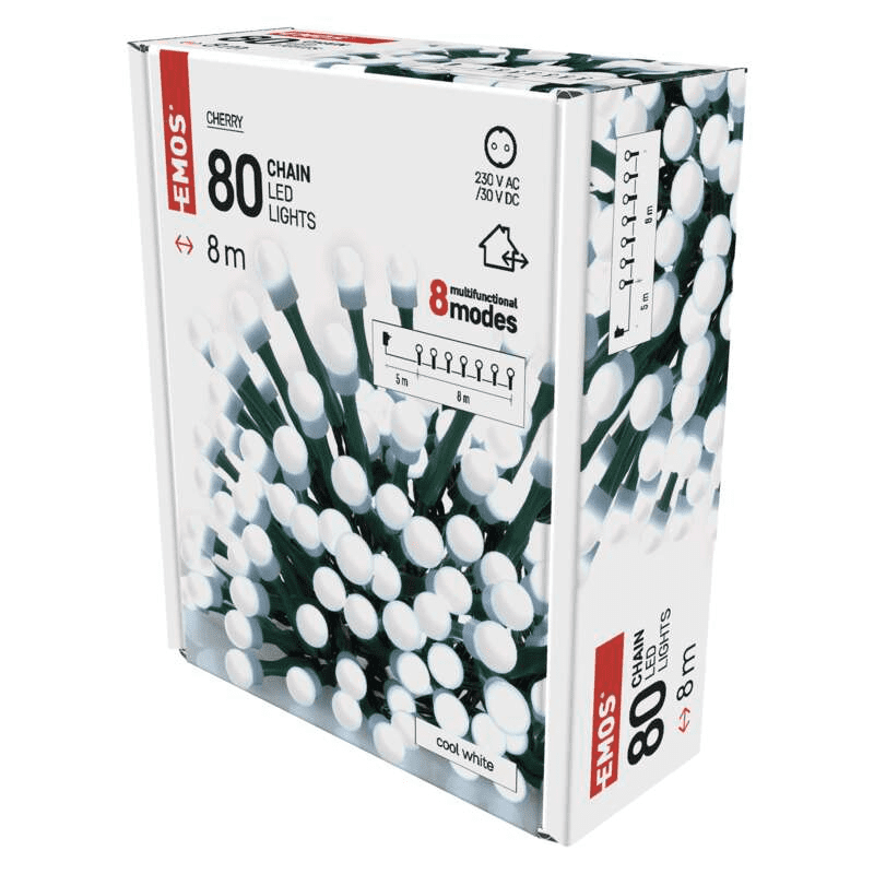 Božićne lampice marke EMOS za unutarnju i vanjsku upotrebu u obliku LED lanca Lanac je dugačak 8 m, sadrži 80 LED-ova.