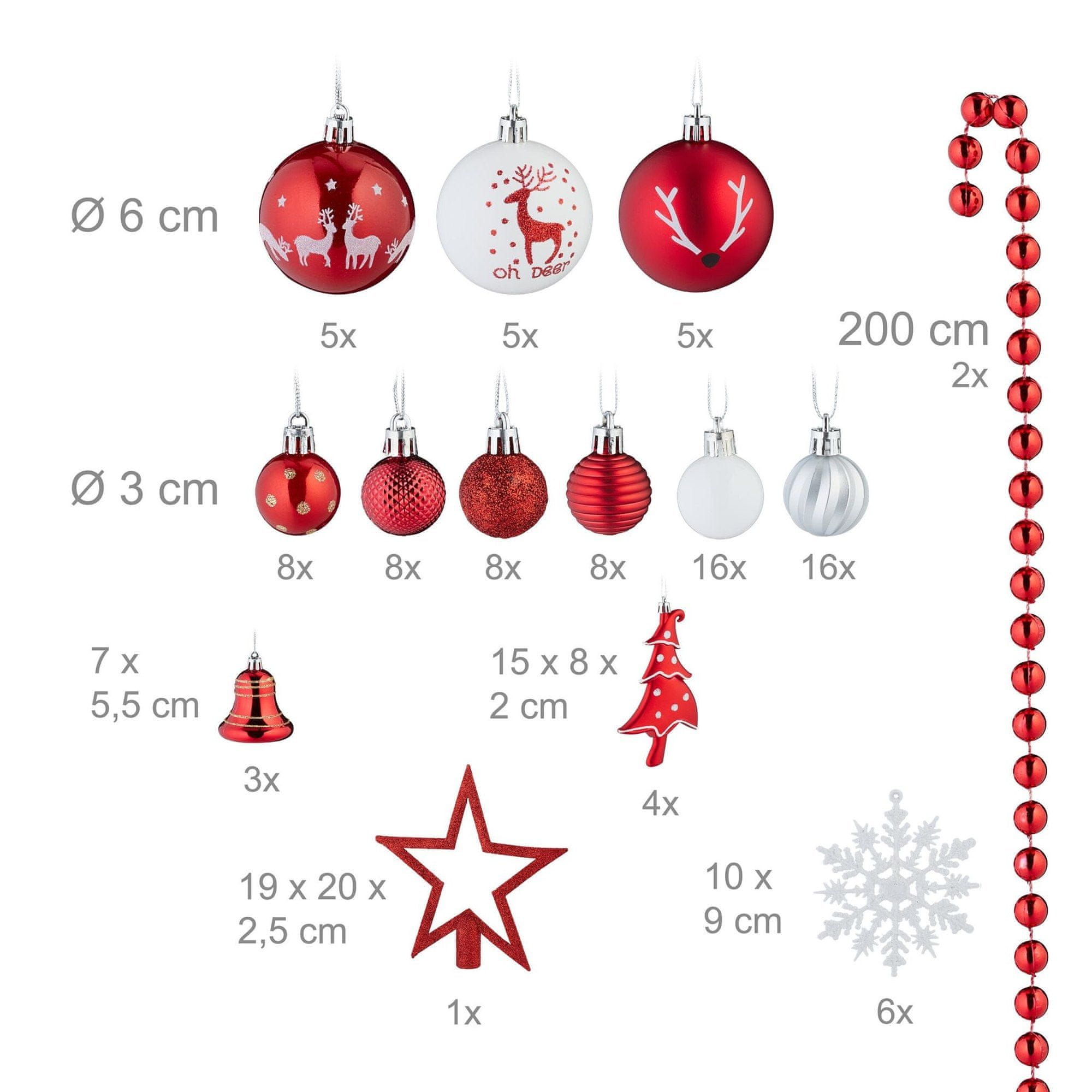 Set od 103 plastične kuglice za božićno drvce s raznim oblicima (kuglice, zvijezde) i završnim obradama (mat, sjajna, svjetlucava). Lako se vješaju uz priložene vrpce, idealne za stvaranje blagdanske atmosfere u zatvorenom i na otvorenom.