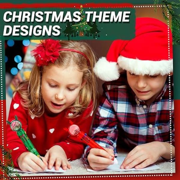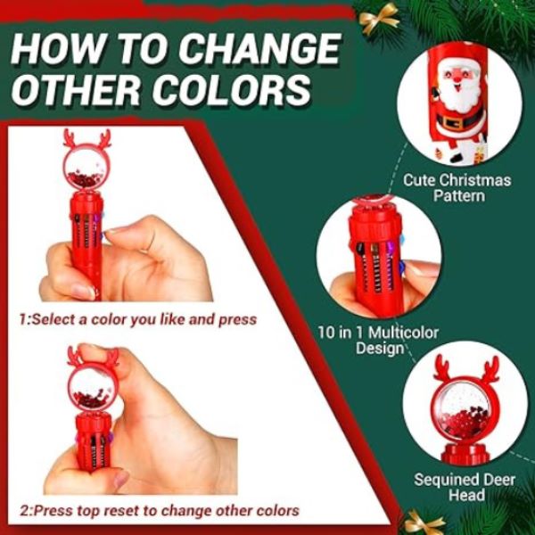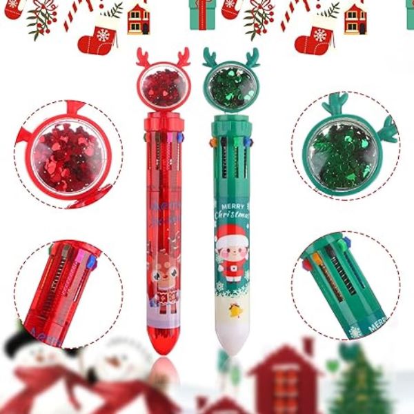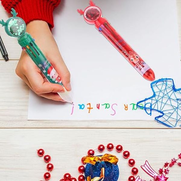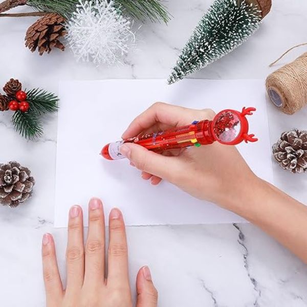 Naša višebojna kemijska olovka s božićnim motivom pruža raznolik spektar od 10 nijansi, uključujući crnu, plavu, crvenu, narančastu, zelenu, ljubičastu, svijetloplavu, smeđu, ružičastu i žutu.