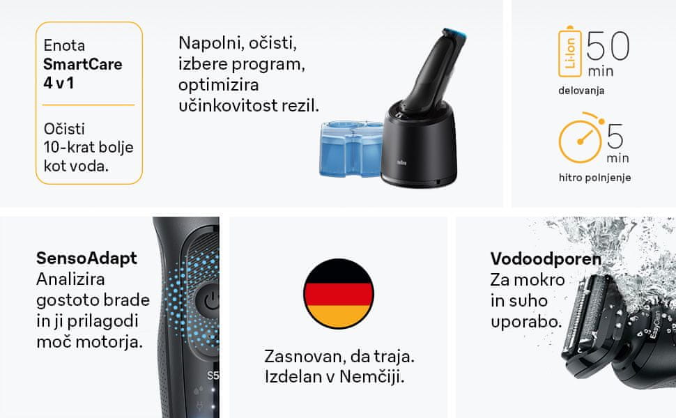 | Sadržaj paketa | Braun Series 5 električni brijač, SmartCare jedinica s uloškom za čišćenje, Nastavak za precizno podrezivanje, Punjač, Četka za čišćenje |