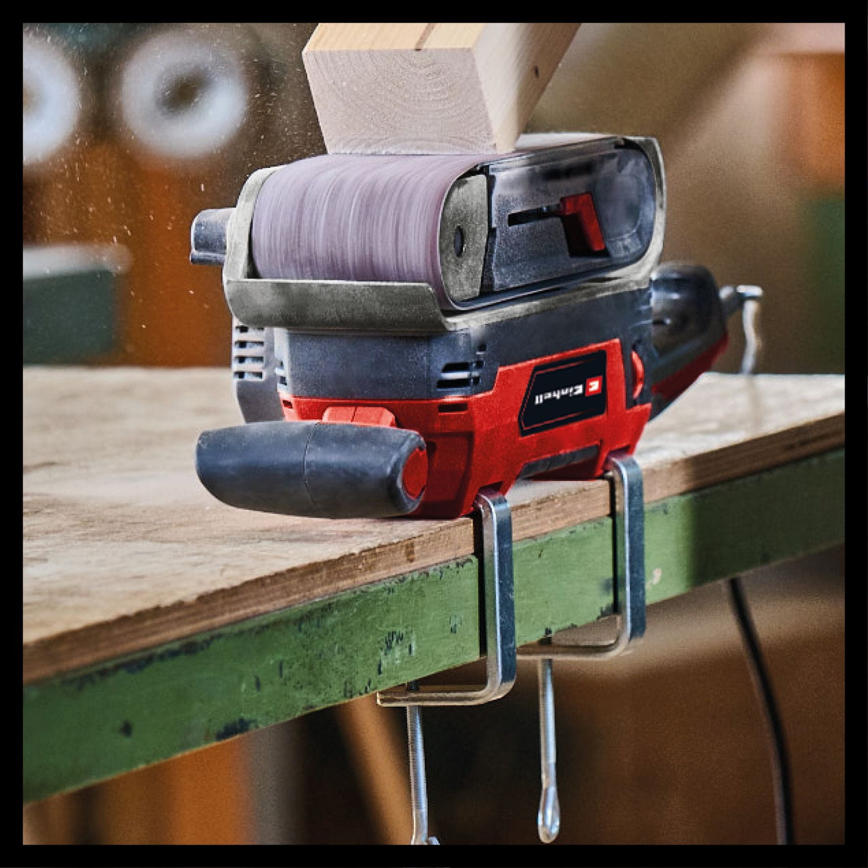 Za stacionarnu uporabu tračne brusilice, uređaj ima ugrađen prostor za pohranu, au opsegu isporuke uključene su dvije montažne stezaljke. Radno mjesto uvijek ostaje čisto zahvaljujući ugrađenom odsisavanju prašine s kutijom za sakupljanje prašine ili spajanjem Einhell mokro/suhog usisavača.