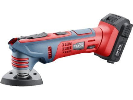 Bežična višenamjenska brusilica namijenjena je rezanju i odvajanju drvenih materijala, plastike, gipsanih ploča i mekih metala (npr. bakra, aluminija, nekaljenih čavala, legura mekih metala), kao i za turpijanje, brušenje i struganje manjih površina. Alat vam omogućuje precizno obavljanje radova na teško dostupnim mjestima, poput izrade izreza u kutovima namještaja, pločica itd. Njegova glavna prednost je baterijski pogon, koji vam omogućuje da brusilicu ponesete sa sobom gdje god trebate raditi, bez obzira na to postoji li opskrba električnom energijom. Za normalan rad dovoljne su jedna ili dvije baterije od 2000 mAh, koje možete brzo napuniti u brzom punjaču, za zahtjevniji ili dulji rad preporučujemo veće baterije kapaciteta 4000 mAh. Baterija se može koristiti u svim vrstama alata serije EXTOL SHARE20V. Zahvaljujući korištenoj Li-ion tehnologiji, može se puniti u bilo kojem trenutku bez smanjenja kapaciteta. Li-ionska baterija vrlo sporo gubi energiju zbog samopražnjenja i dugo traje kada je napunjena.