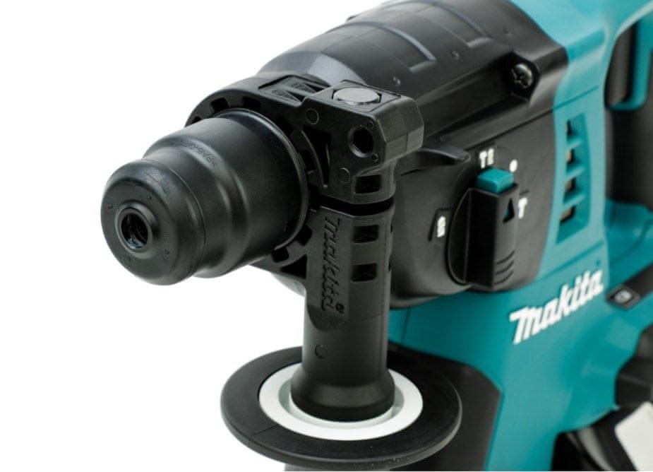 Držač alata radi prema sustavu SDS-Plus. Poseban gumeni spoj, koji brine o spajanju baterije, drastično smanjuje prijenos vibracija na bateriju. Zatvorena ručka čini upravljanje učinkovitijim. Stavite ruku u os rotacije, što uvelike olakšava guranje nastavka u procesor. Čekić ima poboljšanu zaštitu od prašine i vode.